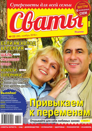 «Сват плохого не посоветует», — говорят в народе. В каждом номере журнала «Сваты» вы найдете: проверенные советы от читателей, экспертов, юристов, медиков, психологов, кулинарные рецепты, секреты здоровья, помощь в воспитании детей разного возраста, песни, байки, анекдоты. И все это в ярком, красочном оформлении.