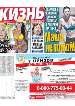 Еженедельная газета, предназначенная для семейного чтения. Основные рубрики: самые скандальные и интересные события прошедшей недели, политический комментарий Леонида Шахова, пикантные истории из звездной жизни, советы профессионального психолога, действенные рецепты здоровья, гороскоп, кроссворд, конкурсы, сканворды, розыгрыши билетов в кинотеатры и множество других призов. Приложения к газете «Жизнь»: «Телеэкран» - телепрограмма с подробными анонсами кино и сериалов, «Овертайм» - спортивное обозрение.