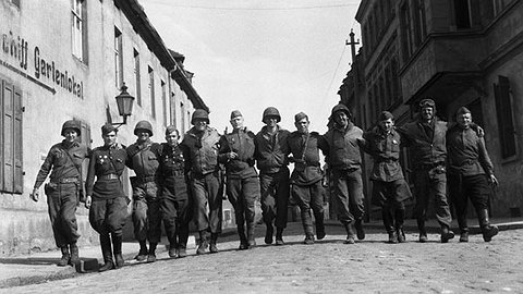 Белоусович: Наш полк отошел к югу, остановился недалеко от реки Мульде, это приток Эльбы. Части Красной армии были где-то на другом берегу Эльбы. Несколько дней мы стояли, все были очень осторожны. Представьте, если бы мы не опознали друг друга и затеяли перестрелку, это была бы крупная неприятность. Наконец, когда формировали три патруля, которые должны были установить контакт, кто-то в командовании полка вспомнил, что в одной из рот есть солдат, знающий русский. Меня вызвали и включили в состав патруля из примерно 20 человек. Рано утром 25 апреля мы переехали мост через Мульде на джипах. У нас была задача установить контакт с советскими частями. Было еще два маленьких патруля из нескольких человек. Так случилось, что с разницей в два-три часа эту задачу выполнили все три группы. У нас было принято считать, что любой солдат одного из патрулей мог говорить, что был на первой встрече с русскими.