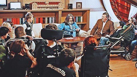 В Каминном зале хосписа аншлаг. Чуть смущенный Конюхов вжал ладони в колени, дети и родители улыбаются глазами так, что дырявят.