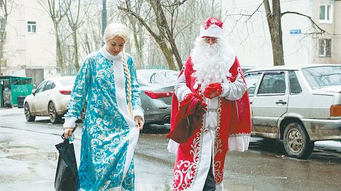 …Деду Морозу и Снегурке приходится переодеваться в подъезде перед тем, как зайти в квартиру. На машине ездить неэффективно из-за пробок, и вот артисты с огромными сумками наперевес входят в подъезд — и там происходит волшебное перевоплощение.